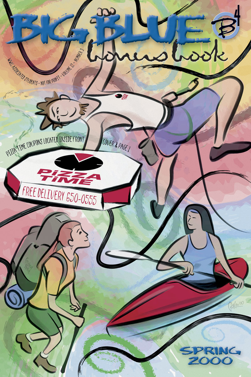 Book cover for the Big Blue Bonus Book, which is a coupon book that is freely distributed to Western Washington University students when they purchase text books at the beginning of the academic quarter. The book is publlished three times a year, containing several coupons from local Bellingham businesses. |