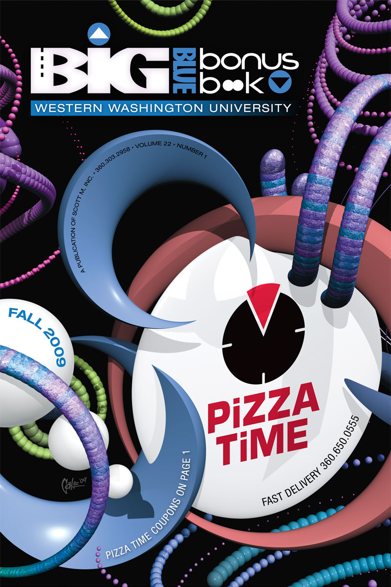Book cover for the Big Blue Bonus Book, which is a coupon book that is freely distributed to Western Washington University students when they purchase text books at the beginning of the academic quarter. The book is publlished three times a year, containing several coupons from local Bellingham businesses. |